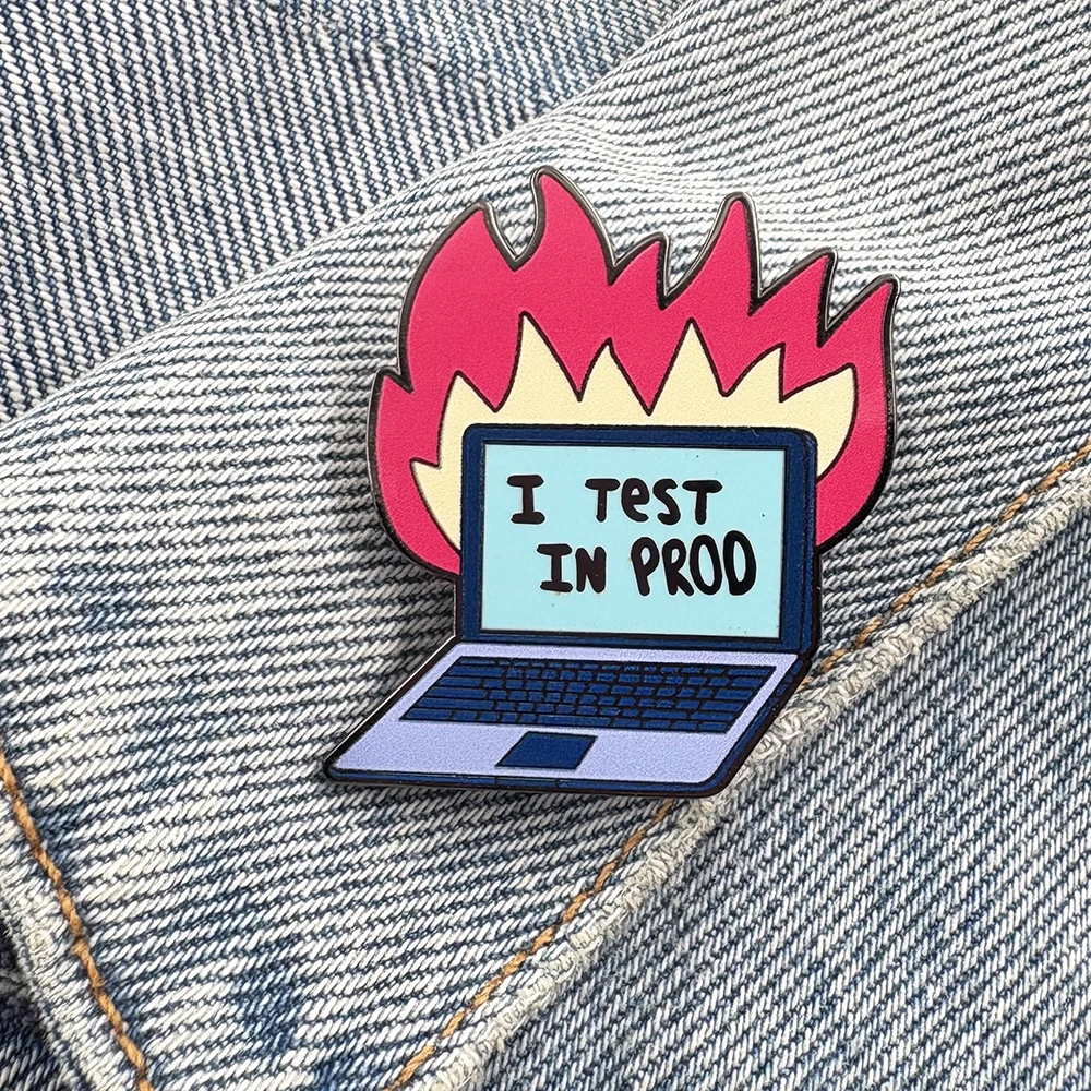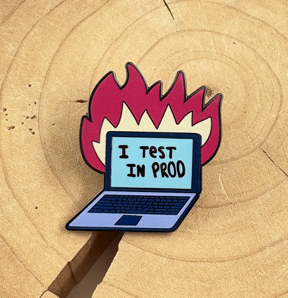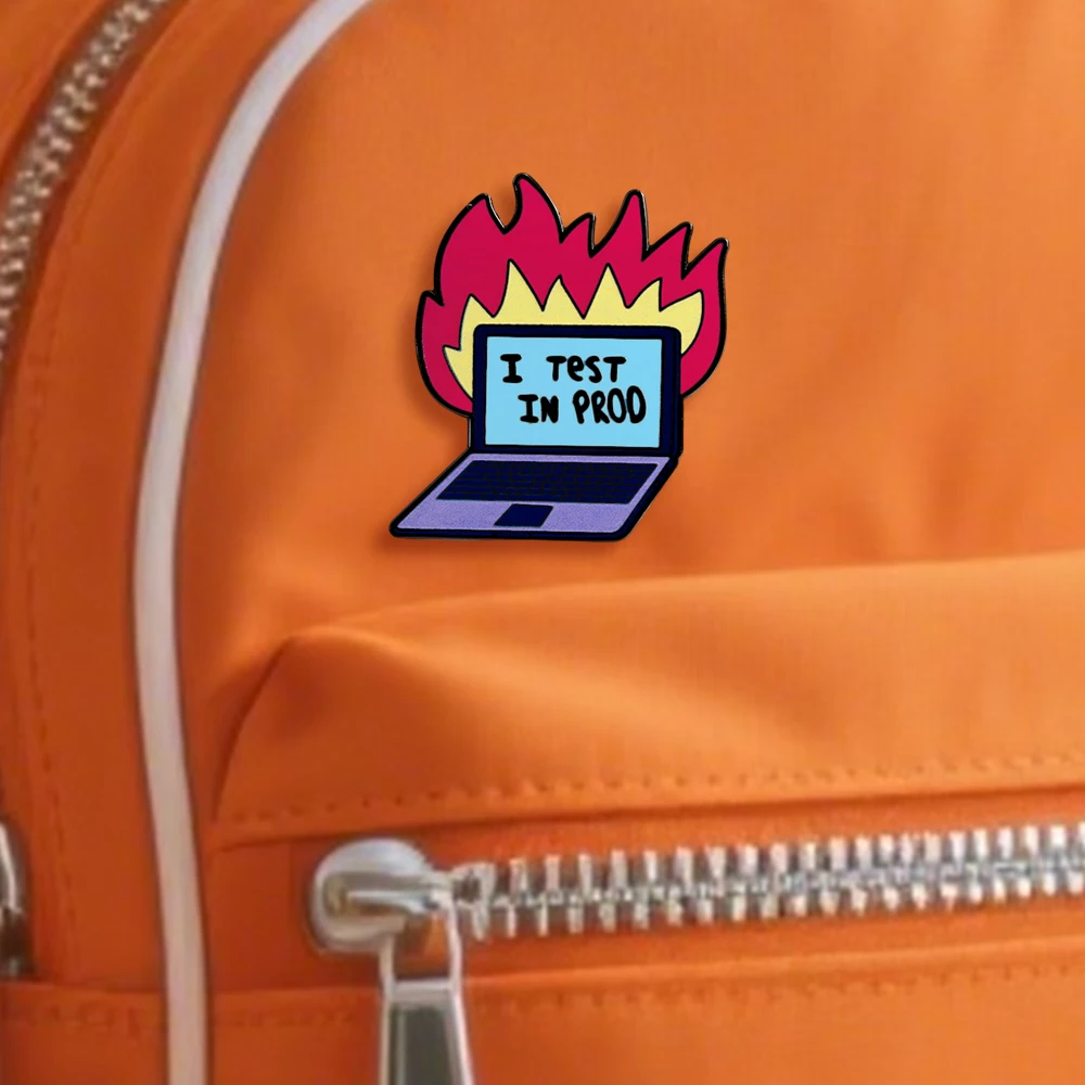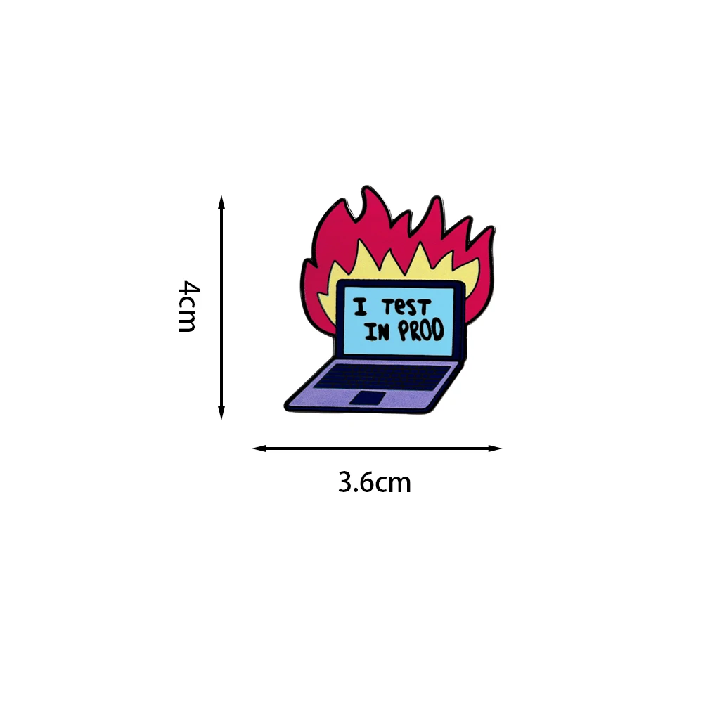 Introduction/Description principale : Un pin's émaillé coloré et humoristique pour les développeurs, testeurs et professionnels de l'informatique. Ce pin's représente un ordinateur portable en feu avec le texte ironique et audacieux « I TEST IN PROD », une blague courante dans la communauté du code sur les pratiques de développement risquées. C'est un accessoire coloré et original, parfait pour personnaliser vestes, sacs ou cordons.
