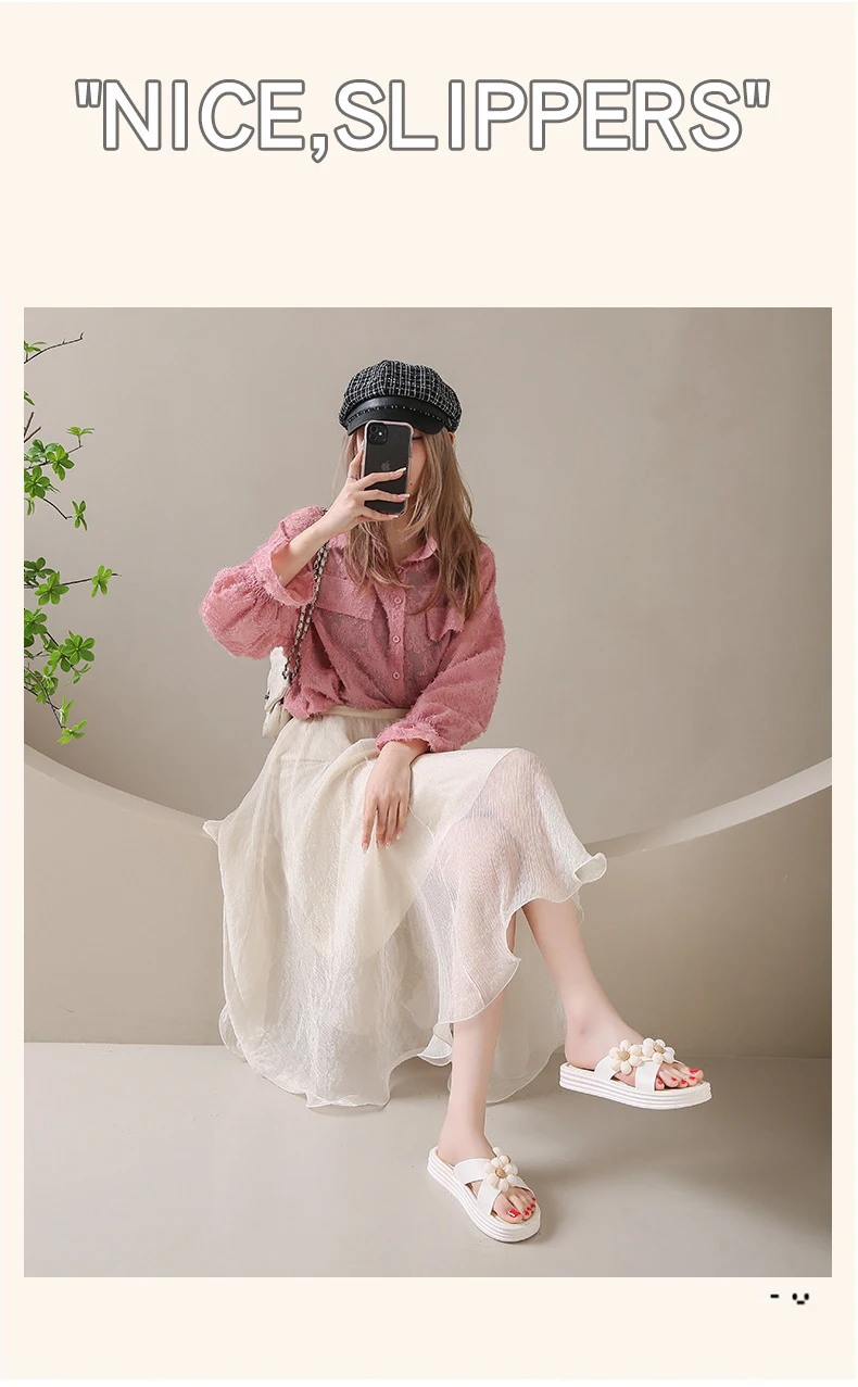Included Charm: The highlight is the voluminous flower appliqué (pom-pom) or bead cluster on the top of the strap, adding a feminine and elegant touch. The sole is thick, ensuring comfort and height.