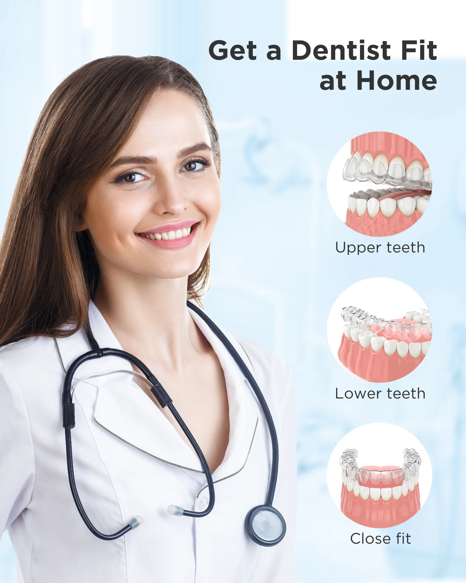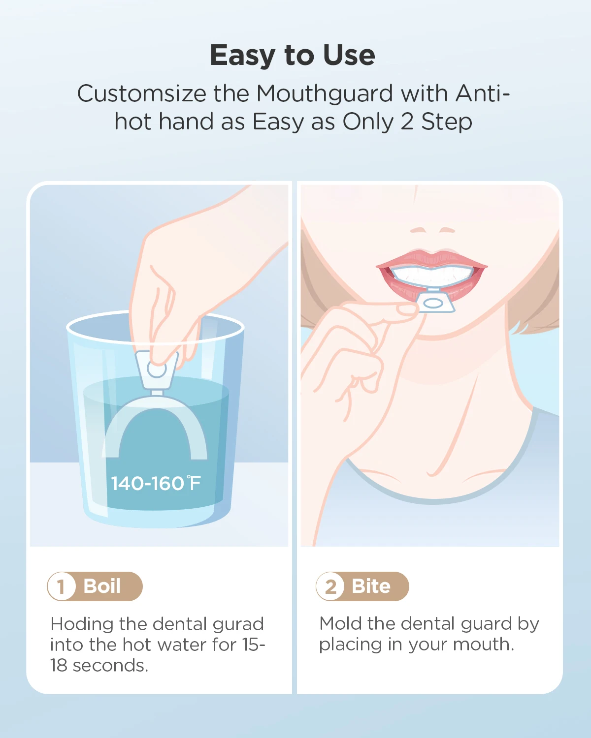 Customization: Easy to Use and customize in Only 2 Step by boiling them in hot water ($140-160^{\circ}F$) and then biting down. They fit both Upper teeth and Lower teeth.