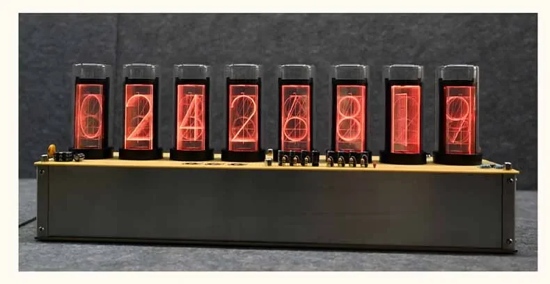 A unique and captivating desktop timepiece that marries retro-futuristic aesthetics with modern technology. This clock utilizes vintage-inspired glass vacuum tubes to display the time with a glowing, fiery digital effect, creating an eye-catching and nostalgic centerpiece for any office, studio, or living space.