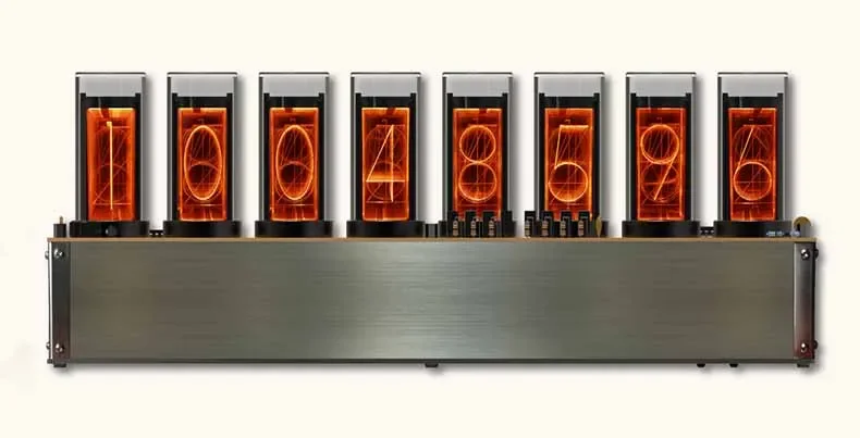 Product Theme: Retro-futurism, vintage technology (specifically the Nixie tube aesthetic), and high-tech desktop décor, appealing to enthusiasts of mid-century design and electronics.