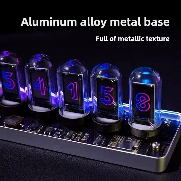 A sophisticated and visually stunning desktop clock that uses modern technology to emulate the nostalgic aesthetic of vintage Nixie tubes. This device features a sleek, metallic aluminum alloy base and customizable display options, offering a unique blend of retro-futurism and high-end electronic décor.