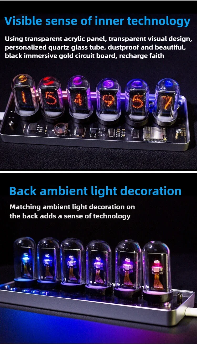 Included Charm: The tubes are protected by a customized quartz glass cover and powered by a high-quality circuit board (black-immersed gold process). The display offers a multi-color digit option with various color themes.