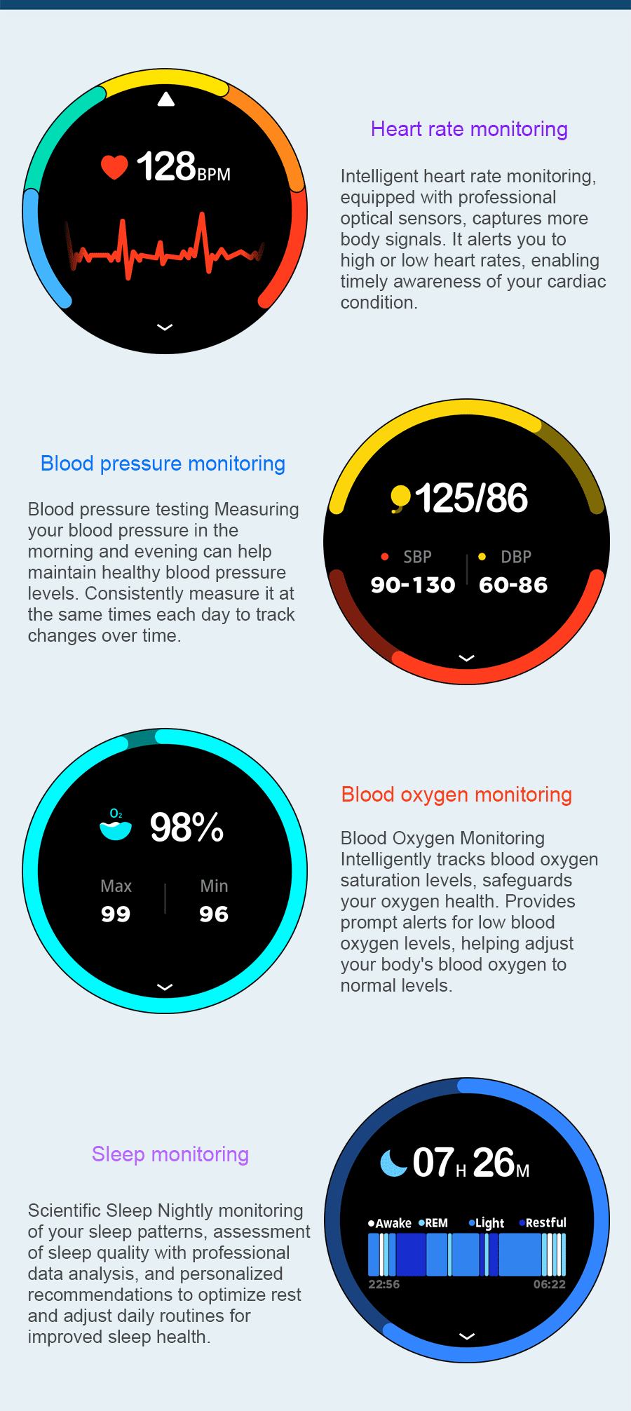 $24/7$ Motion Movement: Understands your health status and helps develop a better lifestyle through continuous monitoring of vital signs, including Heart Rate, Blood Pressure, Blood Oxygen (SpO2), and Sleep Monitoring.