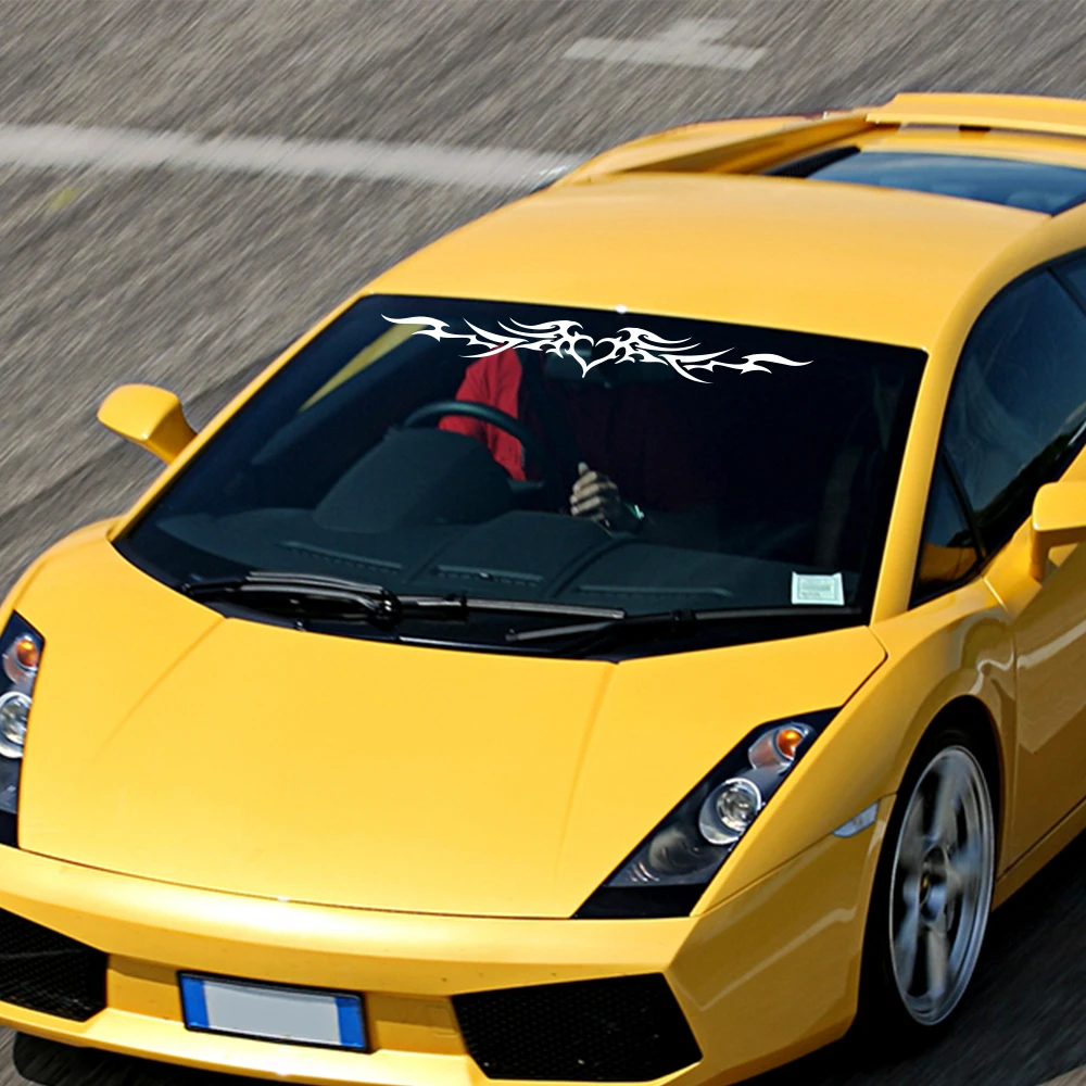 Description: A large, stylish vinyl decal featuring an intricate tribal graphic design with sharp, flowing lines. This decal is designed to be applied to car windows, typically the rear window or windshield, to add a personalized and aggressive aesthetic to the vehicle's exterior.